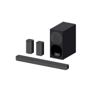 The Sony HT-S20R sports a more traditional home theatre setup with multiple components—a soundbar, wired subwoofer, and two rear speakers. This design ensures a truly immersive surround effect, though it involves some cable management.